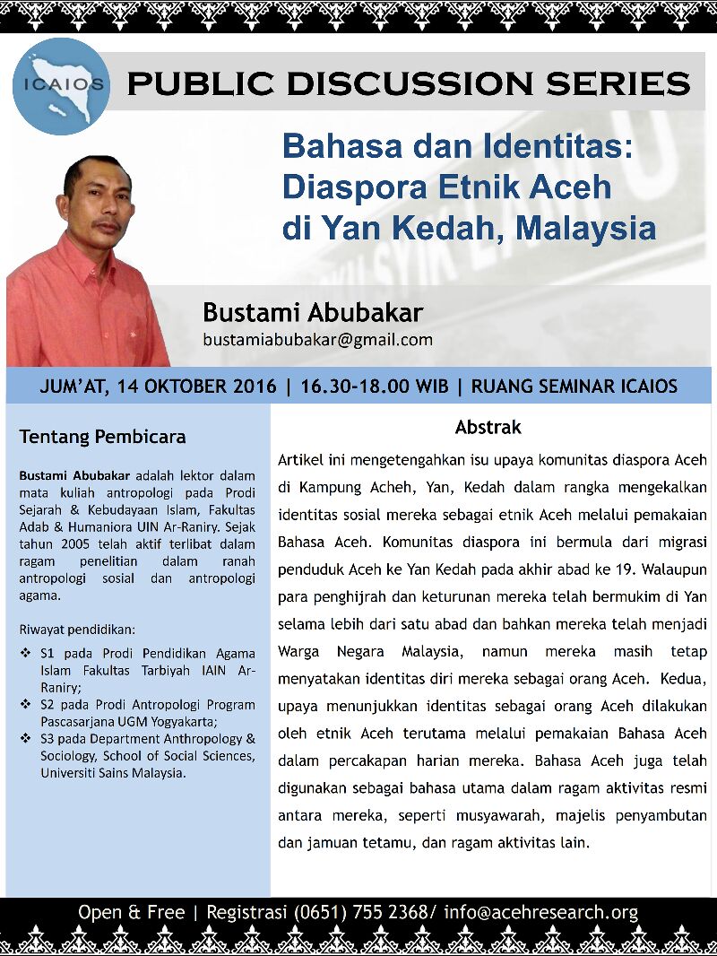 Artikel ini mengetengahkan isu upaya komunitas diaspora Aceh di Kampung Acheh, Yan, Kedah dalam rangka mengekalkan identitas sosial mereka sebagai etnik Aceh melalui pemakaian Bahasa Aceh. Komunitas diaspora ini bermula dari migrasi penduduk Aceh ke Yan Kedah pada akhir abad ke 19. Walaupun para penghijrah dan keturunan meraka telah bermukim di Yan selama lebih dari satu abad dan bahkan mereka telah mei Warga Negara Malaysia, namun mereka masih tetap menyatakan identitas diri mereka sebagai orang Aceh. Kedua, upaya menunjukkan identitas sebagai orang Aceh dilakukan oleh etnik Aceh terutama melalui pemakaian Bahasa Aceh dalam percakapan harian mereka. Bahasa Aceh juga telah digunakan sebagai bahasa utama dalam ragam aktivitas resmi antara mereka, seperti musyawarah, majelis penyambutan dan jamuan tetamu, dan ragam aktivitas lain.